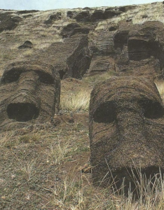 Подобно строителям Стоунхенджа, островитяне при выполнении всех работ имели в своем распоряжении лишь самые примитивные инструменты. Месяцы, а то и годы тяжелого труда уходили на изготовление каждой статуи. А всего их на острове более шестисот. Производство статуй прекратилось внезапно, по неизвестной причине. Настолько внезапно, что скульпторы побросали свои каменные рубила прямо "на рабочих местах". Их инструменты были найдены в каменоломне поблизости от двухсот незаконченных скульптур, среди которых встречаются исполины длиной более 20 метров.