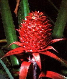 Ананас настоящий Ananas comosus Merrill Семейство бромелиевые Описание. 1. Многолетнее травянистое растение. Листья длиной до 80 см, мясистые, широколинейные, колюче-зубчатые. Соплодие, напоминающее шишку, золотисто-желтое, состоит из множества завязей, сросшихся с прицветником и осью соцветия. 2. Родина - Бразилия. Возделывается во всех тропических странах. 3. Употребляют внутреннюю часть сочного соплодия, на вкус кисло-сладкую, со специфическим ароматом. 4. Содержит сахара (до 15%, в основном сахарозу), органические кислоты (0,5-0,7%, преимущественно лимонную), азотистые соединения (0,3-0,4%), соли калия и меди, аскорбиновую кислоту, бромелин, состоящий из комплекса растительных ферментов типа пепсина и папаина. 5. Сок обладает противовоспалительным действием, а также повышает ферментную активность. Применение. Сок ананаса рекомендуют при различных заболеваниях желудочно-кишечного тракта, сердечно-сосудистой системы и почек (оказывает противоотечное действие), для улучшения пищеварения, лечения функциональных расстройств центральной нервной системы. Благодаря значительному содержанию в мякоти соплодия и в соке аскорбиновой кислоты ананас считается эффективным средством против цинги. Людям с повышенной секреторной активностью желудочного сока употребление ананасового сока не рекомендуется.