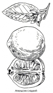 Апельсин сладкий Citrus sinensis L. Семейство рутовые Описание. 1. Вечнозеленое дерево высотой 3-12 м, с густой компактной кроной. Листья темно-зеленые, эллиптические, заостренные, с крылатыми черешками. Цветки белые, душистые, обоеполые. Чашечка маленькая, остролистная, состоящая из 5 чашелистиков; венчик пятилепестковый. Плоды желтые, оранжевыe или оранжево-красные, различной формы, с кожистым околоплодником, сочной кисло-сладкой мякотью. Насчитывается более 100 различных сортов. Цветет почти постоянно. 2. Родина - Китай. Возделывается в садах и на плантациях в субтропических районах. 3. Заготавливают плоды и кожуру плодов. 4. Плоды содержат сахара, органические кислоты, соли, азотистые и красящие вещества, клетчатку, фитонциды, витамины А (до 0,25 мг%), B1 (0,08 мг%), В2 (0,008 мг%) и С (66 мг%). В кожуре плодов есть несколько видов эфирных масел. 5. Возбуждает аппетит, улучшает пищеварение, полезен при запорах, гипертонии, атеросклерозе, болезнях печени, ожирении, подагре, цинге. Применение. Настойка: 20 г корки апельсина на 50 мл спирта настаивают 20 дней, процеживают. Принимают по 10 капель, разведенных в воде, 4-6 раз в день при лихорадке. Апельсиновый сок (или апельсины), принимаемый натощак, возбуждает деятельность кишечника. Сок хорошо утоляет жажду при лихорадочных состояниях; благодаря наличию фитонцидов, сок обладает антисептическим действием и может использоваться для промывания долго не заживающих ран и язв. Апельсины с успехом применяют при авитаминозе, вызываемом острым недостатком в организме витаминов А, В, С. Апельсины противопоказаны при язвенной болезни желудка и двенадцатиперстной кишки, гастрите с повышенной кислотностью желудочного сока.