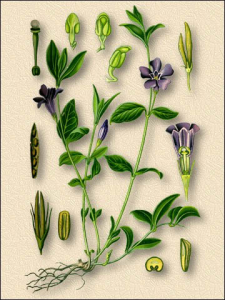 Барвинок малый Vinca minor L. Семейство куртовые Описание. 1. Вечнозеленый кустарник с супротивными листьями, в пазухах которых располагаются темно-голубые цветки. Стебель лежачий, укореняющийся, ветвистый, длиной до 60 см. Цветущие побеги прямостоячие. Листья зимующие, голые, сверху блестящие, эллиптические, на конце заостренные, с коротким черешком. Чашечка голая, пятираздельная, в несколько раз короче трубки венчика. Венчик воронковидный с длинной узкой трубкой, вздутой посередине, с пятираздельным отгибом; доли его кверху расширенные, тупосрезанные. После цветения две части завязи (плодолистики) расходятся в стороны и из них развиваются раскрывающиеся одним швом 2 листовки с семенами без хохолков. Цветет в мае - июне. Растение очень ядовито! 2. Растет по опушкам лесов, кустарникам, склонам балок в европейской части России, но особенно распространен на Украине и на Кавказе. Разводится как садово-парковая культура почти по всей Европе. Другие виды: барвинок травянистый [Vinca herbacea Waldst. et Kit.], барвинок опушенный [Vinca pubescens DUrv.]. 3. Заготавливают облиствленные стебли все лето; корни и корневища выкапывают 1 раз в 4 года, в период цветения. 4. В траве обнаружены около 30 алкалоидов индольного ряда (винин, винкамин, пубесцин, миронин и др.), а также кислоты (урсоловая и аскорбиновая), виницилин, кемпферол, дубильные и горькие вещества, флавоноиды, каротин и т. д. 5. Обладает вяжущим, кровоостанавливающим, ранозаживляющим, противораковым, кровоочистительным, противолихорадочным, слабительным и успокаивающим действием. Алкалоиды, содержащиеся в растении, угнетая симпатические ганглии, возбуждают парасимпатические окончания вегетативной нервной системы, чем и обусловливается снижение артериального давления. Винкамин (основной алкалоид барвинка малого), обладая сходными с резерпином седативным и нейроплегистическим свойствами, оказывает избирательное действие на сосуды головного мозга, снимает спазмы и уменьшает головные боли. Применение. Отвар: 1 ст. л. сухой травы барвинка на 300 мл кипятка варят 15 минут, настаивают 1 час, процеживают. Принимают по 100 мл 3 раза в день при поносе, гипертонии (наряду с общеклиническим улучшением снижаются коагулирующие свойства крови и наблюдается антикоагулянтная активность), малярии и других лихорадочных заболеваниях, а также как противоглистное и кровоостанавливающее средство. Наружно применяют при гнойных язвах, ранах, сыпи и кожном зуде, заболеваниях десен и слизистой оболочки рта. В Болгарии из барвинка получены препараты винкапан и винкадрекс, а в Венгрии - винкатон и девинкан. Их назначают при спазмах сосудов мозга, неврогенной тахикардии, начальных стадиях гипертонической болезни. Препараты барвинка эффективны для лечения детей с невритами лицевого нерва, полиневритами, остаточными явлениями менингоэнцефалита. Кроме того, препараты барвинка назначают при головных болях различного происхождения: при органических поражениях церебральных сосудов, повышении внутричерепного давления, остеохондрозе, атеросклерозе, вегетативной вазомоторной и диэнцефальной патологии, а также при депрессивных состояниях, развивающихся при шизофрении, маниакально-депрессивных психозах, органических заболеваниях головного мозга в результате травм, энцефалита и т. д. Препараты барвинка довольно широко используются в от