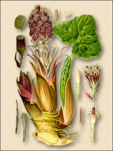 Белокопытник гибридный (белокопытник лекарственный) Petasites hybridus (L.) Gaertn. Petasites officinalis Moench. Семейство сложноцветные Описание. 1. Многолетнее травянистое растение с горизонтальными толстыми (диаметром до 2-3 см) корневищами длиной до 1,5 м, расположенными на поверхности или в верхнем слое почвы. От утолщенных узлов отходят тонкие корни. Прикорневые листья крупные, округло-сердцевидные, неравномерно-зубчатые, снизу беловойлочные. Цветочные стебли (стрелки) высотой 40-60 см, шерстистоопушенные, красноватые, усаженные чешуевидными стеблеобъемлющими листьями; появляются в апреле до распускания листьев, а во второй половине мая - первой половине июня после плодоношения отмирают. Настоящие листья, образующие розетки, развиваются после цветения. Они очень крупные, округлые, с сердцевидным основанием. Цветки грязно-пурпурные, пахучие; краевые цветки в корзинках нитевидные, средние - трубчатые. Цветочные корзинки собраны в кисти. Плод - семянка с хохолком. Цветет во второй половине апреля - первой половине мая. Плодоносит в мае. 2. Растет по сырым местам, по берегам рек, прудов и по оврагам в западных, южных и центральных областях России. 3. Заготавливают листья в июне - августе; корни - осенью, после вегетационного периода. 4. В корневищах обнаружены тритерпеновые сапонины (около 7%), дубильные вещества (5%), эфирное масло (до 0,18%), следы алкалоидов, флавоноиды, смолистые вещества, петазол, петазин, инулин, холин, горькие вещества, слизи, стеарин, таннины, органические кислоты и большое количество марганца. Листья содержат те же химические вещества, но в меньших количествах. Одна- ко флавоноидов в надземной части, особенно в соцветиях, содержится почти в два раза больше, чем в корнях. 5. Обладает спазмолитическим, потогонным, отхаркивающим, противовоспалительным, гипотензивным, антикоагулирующим, противоглистным, обезболивающим и ранозаживляющим действием. Применение. Отвар: 2 ч. л. сухих корней белокопытника на 250 мл кипятка варят 15 минут, настаивают 1 час, процеживают. Принимают по 20-50 мл 3-5 раз в день при при простудном кашле, хрипоте, удушье, истерических припадках, язвенной болезни желудка и двенадцатиперстной кишки, метеоризме, запорах. Настой: 2 ч. л. сухих листьев белокопытника на 250 мл кипятка настаивают 1 час, процеживают. Принимают по 50 мл 3-4 раза в день при тех же заболеваниях, как и отвар листьев. Перевязки: свежие или сухие листья белокопытника обваривают кипятком, заворачивают в марлю и в виде горячего компресса прикладывают к местам ревматических и подагрических болей. Измельченные свежие листья белокопытника прикладывают к ранам для их заживления, а также к отечным участкам тела для уменьшения отеков. Листья белокопытника гибридного входят в состав сбора Здренко, используемого как симптоматическое средство при лечении папилломатоза мочевого пузыря и анацидных гастритов.