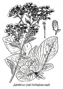 Девясил растопыренный (мухолов) Conyza squarrosa L // Inula conyza DC Семейство сложноцветные Описание. 1. Двулетнее травянистое растение высотой 50-120 см, с круглым ветвистым стеблем. Листья очередные, продолговато-ланцетные, пушисто-тонковойлочные, суженные в черешках, верхние - сидячие. Цветочные корзинки мелкие, многочисленные, собраны в густую щитковидную метелку. Листочки обертки ланцетные, опушенные, с отогнутой травянистой верхушкой. Краевые цветки в корзинках узкие, красноватые, многорядные, короткие, малозаметные. Срединные цветки трубчатые, буроватые. Плод - пушистая семянка. Имеет неприятный запах. Цветет в июне - июле. 2. Растет по берегам рек, в посевах и кустарниках на известковой или каменистой почве в южной полосе европейской части России, в Крыму и на Кавказе. 3. Заготавливают траву во время цветения. 4. Содержит эфирное масло. 5. Обладает мочегонным, ветрогонным, инсектицидным, антисептическим, противовоспалительным, обезболивающим и ранозаживляющим действием. Применение. Настой: 1 ст. л. сухой травы девясила на 300 мл кипятка настаивают 20 минут, процеживают. Принимают по 1 ст. л. 4 раза в день до еды при одышке, болях в груди, как мочегонное и ветрогонное средство. Настоем промывают кожу при сыпи. Компрессы: измельченную траву девясила прикладывают к гнойным ранам, язвам, ушибам, вывихам, переломам.