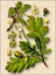 Дуб зимний Quercus petraea Liebl.// Quercus sessiliflora Salisb. Семейство буковые Описание. 1.Листопадное однодомное дерево высотой до 30 м, с прямостоячим стволом, широкой, густой кроной. Молодые ветви голые, серо-коричневые, гладкие. Листья черешковые, обратнояйцевидные, с несколькими боковыми долями и с клиновидной основной пластиной, опадающие зимой, но у молодых деревьев нередко часть листьев остается до весны следующего года. Мужские цветки - сережки, длинные, опушенные, собраны в группы с несколькими светло-желтыми цветками. Женские цветки сидят в пазухах листьев по одному или по 2-5. Желуди похожи на желуди летнего дуба, но более мелкие, без продольных линий; чашка у них не такая глубокая, почти сидячая или с коротким черешком. Цветет после появления листьев. 2. Растет в лиственных лесах Западной Европы, в Малой Азии и европейской части России. Поднимается в горы на высоту до 1600 м над уровнем моря. 3. Заготавливают кору молодых ветвей во время раннего сокодвижения; листья - летом; желуди - осенью, после их созревания. 4. Древесина содержит таннины (до 5% - касталгин, вескалагин, касталин, вескалин), причем содержание таннинов уменьшается с возрастом растения. В коре содержатся дубильные вещества, кислоты (пантетеновая, свободная галловая, эллаговая), пентозаны, тритерпеноиды, стероиды, катехины, сахара, кверцетин, метилпентозаны, левулин, витамины. Желуди содержат белки, жиры, дубильные и красящие вещества, яблочную кислоту, целлюлозу, минеральные соли. 5. Кора обладает вяжущим, антисептическим, противовоспалительным, бактериостатическим, противогнилостным и кровоостанавливающим действием. Применение. В лечебных целях дуб зимний (его кора, листья и т. д.) применяется наравне с дубом черешчатым.