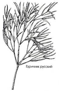 Горичник русский (адамово ребро) Peucedanum ruthenicum MB Семейство зонтичные Описание. 1. Многолетнее травянистое растение высотой 50-100 см, с толстым стержневым корнем. Стебель ветвистый, цилиндрический, бороздчатый. Прикорневые листья на длинных черешках, у основания расширенных во влагалище, тройчаторассеченные; в очертании пластинка листа широкотреугольная, конечные доли длинные, узколинейные, с одной жилкой. Стеблевые листья меньшей длины, менее рассеченные; верхушечные - в виде влагалищ. Цветки мелкие, светло-желтые, собраны в сложный зонтик. Верхушечный зонтик имеет 14-20 неравных лучей, боковые зонтики - меньше. Плод -яйцевидная двуребристая двусемянка. Цветет в июле - августе. 2. Растет в степях, лесостепях на песчаных и известковых почвах в южной полосе европейской части России и на Кавказе. 3. Заготавливают корни поздней осенью или ранней весной; траву - с июля по август; семена - после их созревания. 4. Корни содержат эфирное и жирное масла, кумарины, терпеноиды. В стеблях и листьях найдены флавоноиды, в том числе кверцетин, рутин, фурокумарины; в соцветиях - стероиды, кумарины; в цветках - флавоноиды; в плодах - эфирное масло, фурокумарин, жирное масло, в состав которого входят кислоты (пальмитиновая, олеиновая и линолевая, вероятно, в виде глицеридов). 5. Обладает мочегонным, возбуждающим, обезболивающим, отхаркивающим и противовоспалительным действием, усиливающим деятельность пищеварительных и потовых желез. Применение. Отвар: 1 ст. л. измельченных корней горичника на 250 мл воды кипятят 15-20 минут, настаивают 2 часа, процеживают. Принимают по 1 ст. л. 3 раза в день при простудных заболеваниях, кашле, головной боли, как улучшающее пищеварение и мочегонное средство. Наружно применяют как обезболивающее и противомикробное средство для промывания гнойных ран, при зубной боли и неприятном запахе изо рта. Настой: 1 ч. л. сухих корней или 1 ст. л. измельченной травы горичника на 400 мл холодной воды настаивают 8 часов, процеживают. Принимают по 100 мл 3-4 раза в день до еды при головной боли, бронхите, бронхиальной астме, атеросклерозе, бессоннице, ревматизме, подагре и как противомалярийное, желудочное и кровоочистительное средство. Настойка: 25 г измельченных корней горичника на 100 г спирта настаивают 21 день, процеживают. Принимают по 25 капель 3 раза в день при указанных выше заболеваниях. Получаемый из корней горичника препарат пеуцеданин используют для лечения витилиго и рака молочной железы.