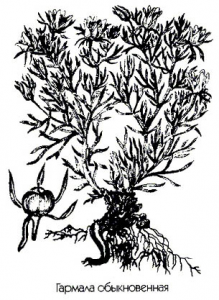 Гармала обыкновенная (могильник, рута дикая, собачье зелье) Peganum harmala L. Семейство парнолистниковые Описание. 1. Многолетнее травянистое растение высотой 20-80 см, с сильным специфическим запахом. Корень стержневой, длиной до 3 м и толщиной до 10 см, многоглавый, деревянистый, несущий многочисленные прямостоячие, сильноветвистые, бороздчатые, голые стебли. Листья неправильные, тройчаторассеченные на заостренные доли. Цветки бледно-желтые или белые, сидящие по одному на коротких цветоножках. Чашелистики (их 5) часто трехраздельные, длиной 11-25 мм. Лепестки (их 5) длиной 12-25 мм. Плод - коробочка, приплюснутая, шаровидная, трехгнездная, трехстворчатая. Семена многочисленные, коричневатые или темно-бурые, угловатые, мелкобугорчатые. Цветет и плодоносит в мае - августе. Растение ядовито! 2. Растет на солонцеватых и глинистых почвах, около колодцев, на пустынных пастбищах, каменистых склонах, пустырях, у дорог и редко как сорняк в посевах на юге России, в Молдавии, Болгарии, Казахстане, в горах Центрального и Западного Кавказа, в Западном и Восточном Средиземноморье, Малой Азии, Монголии и Индии. 3. Заготавливают траву (без грубых приземных частей) во время бутонизации и цветения; семена - осенью, после их полного созревания; корни - ранней весной или поздней осенью. 4. Содержит значительное количество алкалоидов. Из суммы алкалоидов сначала выделены в чистом виде гармалин, гармин (банистерин), гармалол и пеганин (вазицин), а в последние годы - пегамин, пеганол, дезоксипеганин, пеганидин (в траве) и др. Установлено, что из алкалоидов, содержащихся в семенах, 50-95% приходится на гармалин, что в корнях преобладает гармин (67-74% от общего количества), а в траве основную массу составляет пеганин (до 78% от общего количества алкалоидов). Выявлено также, что в молодых корнях вдвое больше алкалоидов, чем в старых, причем преобладает гармин. По мере развития надземной части растения уменьшается и количество алкалоидов, и доля пеганина в нем, а количество гармина увеличивается. Качественный состав алкалоидов сильно зависит от места произрастания растения. Помимо алкалоидов, из семян растения выделены красное красящее вещество и высыхающее жирное масло. В траве содержится протеин (24%), жирное масло (4%) и экстрактивные вещества (31%). 5. Фармакологические исследования 1%-ного и 10%-ного настоев травы показали, что эти препараты обладают противостафилококковой активностью. 1%-ный отвар и 0,25%-ный раствор пеганина обладают очень сильным антимикробным действием. Гармин оказывает возбуждающее действие на двигательные центры коры головного мозга (подобно камфоре) и на центральную нервную систему, понижает кровяное давление, учащает дыхание, расслабляет мускулатуру кишечника, матки, сердца и расширяет периферические сосуды. Алкалоид пеганин (пеганин гидрохлорид) действует как антихолинэстеразное средство, т. е. стимулирует гладкую мускулатуру матки и кишечника, увеличивает количество выделяемой желчи, имеет бронхоспастическое действие, оказывает негативный инотропный эффект на сердце и понижает количество крови в коронарных сосудах, а также используется как слабительное средство при запорах и атонии кишечника. Применение. Лечебные свойства гармалы были известны еще в глубокой древности. Например, в древнейшем памятнике персидско-таджикской культуры Авесте (VII-V вв. до н. э.