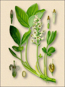Вахта трехлистная (трифоль, бобовник) Menyanthes trifoliata L. Семейство вахтовые Описание. 1. Многолетнее травянистое растение, которое ранее входило в Семейство горечавковых. Растение голое, с длинным, толстым, ползучим, покрытым чешуйками корневищем, несет несколько тройчатых листьев на длинных черешках, расширяющихся у основания. Листочки короткочерешковые, обратнояйцевидные, на верхушке туповатые, сочные, сизовато-зеленые, напоминающие листочки огородного боба. Безлистный цветочный стебель (стрелка) выходит из пазухи одного из листьев и несет на верхушке довольно густую кисть. Цветки диаметром до 1 см. Чашечка пятираздельная, с разрезами до половины длины и тупыми долями. Венчик бело-розовый, воронковидный, с острыми долями, длиннореснитчатыми с внутренней стороны. Плод - коробочка. Цветет в мае - июне. 2. Растет по травянистым и моховым болотам, по заболоченным и топким берегам рек, озер, иногда в воде почти на всей территории России. 3. Заготавливают листья во время цветения. Их обрывают у основания пластинки (без черешков) и сушат на открытом воздухе в тени. Перед сушкой удаляют почерневшие и пожелтевшие листья. 4. Листья содержат горькие гликозиды, из которых важнейшим является мениантин, распадающийся от кислот и нагревания на глюкозу и бесцветное эфирное масло, а также кислоты (муравьиную, уксусную, пальмитиновую, фосфорную, смолистую), фитостерин, холин, таннины, жирное масло и др. 5. Листья возбуждают аппетит, способствуют усилению желудочной секреции, улучшают пищеварение, обладают желчегонным, противолихорадочным, кровоочистительным и антифебрильным действием, являются метаболическим стимулятором. Применение. Настой: 1,5 ч. л. листьев вахты на 250 мл кипятка настаивают 1 час, процеживают. Принимают по 1 ст. л. 3-4 раза в день за 15 минут до еды при диспепсии, как средство, возбуждающее аппетит, при спазмах желудка и кишечника, а также при артритах, простуде, головной боли, невралгии, мышечных спазмах, истощенности, сухом кашле. Настойка: измельченные свежие листья вахты настаивают на спирту (1:5) 20 дней, процеживают. Принимают по 10-15 капель 3-4 раза в день при указанных выше заболеваниях.