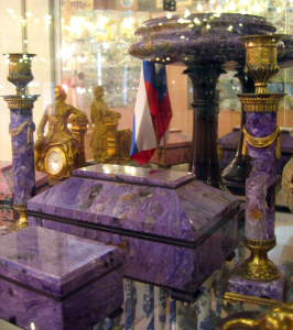 Интересно о чароите. С открытием чароита связана примечательная история. Первооткрыватель месторождения Юрий Гаврилович Рогов был отправлен правительством в заграничную командировку. Там он зашел в минералогический музей Лувра, который претендовал на наличие полной коллекции всех минералов Земли и, показав пластинку из сиреневой породы, попросил определить минерал. Сотрудники музея были вынуждены признать, что такого минерала у них нет, и предложили купить образец. Но советский геолог отказался.