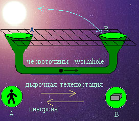 Другими словами, наблюдатель может просто шагнуть через туннель из точки старта А в точку финиша В, расположенную, например, в другой галактике. Через червоточину можно рассматривать вблизи, как через дверь, с близкого расстояния, звёзды другой галактики. Лёгкое усилие, и наблюдатель плавно переходит с Земли (точка А) в соседнюю галактику (точку В), и телепортация осуществлена.