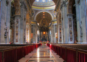 Большой купол собора высотой 136 м был спроектирован Микеланджело, но завершен лишь после его смерти. Неф имеет длину 212 м. В центре находится балдахин — свод из позолоченной бронзы, разработанный Бернини в XVII в. Собор имеет 187 м в длину, в нем располагаются одиннадцать часовен и сорок пять алтарей. Собор Святого Петра — самый большой в истории христианства, а его купол — самый крупный в Европе.