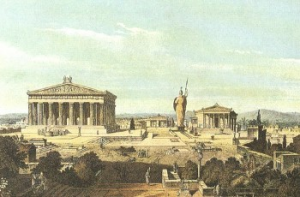 Прошли десятилетия, затем века, и скромное местное празднество превратилось во впечатляющие панэллинские состязания, а Олимпия — в значительный архитектурный комплекс. Жемчужиной комплекса должен был стать храм Зевса, средства на строительство которого в 470 г. до н. э. собирали по всей Элладе. Четырнадцать лет спустя это сооружение было торжественно освящено. Оно имело 64 м в длину и 27 м в ширину и было самым большим храмом во всей материковой Греции того времени. В алтарной части — целле находилась изваянная знаменитым скульптором Фидием статуя Зевса, сидящего на великолепном троне с подлокотниками. Трон сделан из слоновой кости. Внутри у статуи была арматура из железа, дерева и гипса, однако внешний облик поражал зрителя своим великолепием: лицо, руки и ноги, то есть все открытые части тела статуи, вырезаны из слоновой кости. На волосы, одежду и сандалии пошло в целом 200 кг золота. В качестве глаз были использованы драгоценные камни, каждый с кулак величиной. Ноги Зевса покоились на низкой скамье, поддерживаемой двумя львами. В левой руке он держал жезл, на набалдашнике которого сидел орел, его птица-посланник. На приподнятой правой стояла крылатая богиня победы, Ника, прообраз будущих христианских ангелов. Лишь она была ростом с обыкновенного, хотя и довольно высокого человека. В 393 г. император Феодосии I запретил языческий культ Олимпии. Храм Зевса еще во II в. сильно пострадал от землетрясения. Какова судьба всемирно известной статуи, точно не известно. По одним источникам, ее уже около 350 г. разобрали на части грабители, по другим — в 475 г. перевезли в Константинополь, где она позже погибла при пожаре.